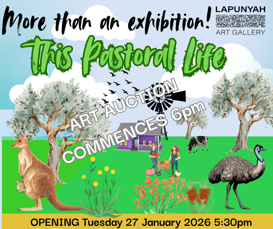 Lapunyah Art Gallery is inviting artists to respond to the theme of ‘This Pastoral Life’ in their chosen medium and celebrate the Year of Rangelands and Pastoralists. Artists may choose to celebrate the land, the flora and fauna, the people, the animals which graze the pastures, or the activities we all enjoy in our rural context.
